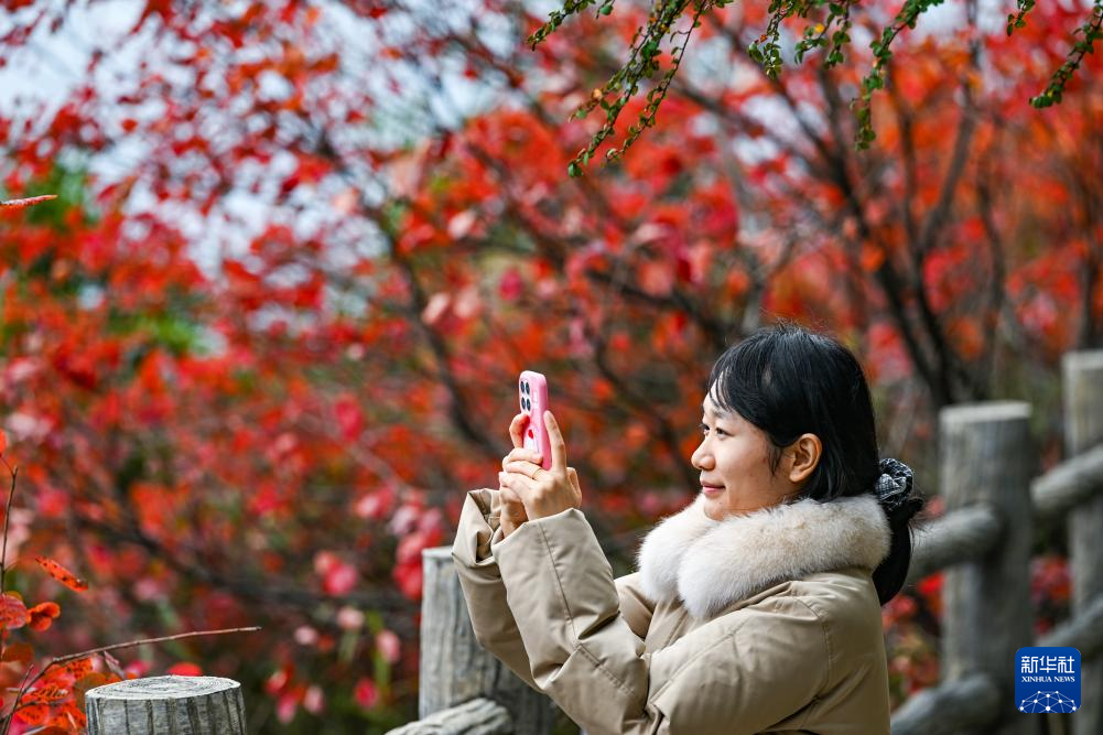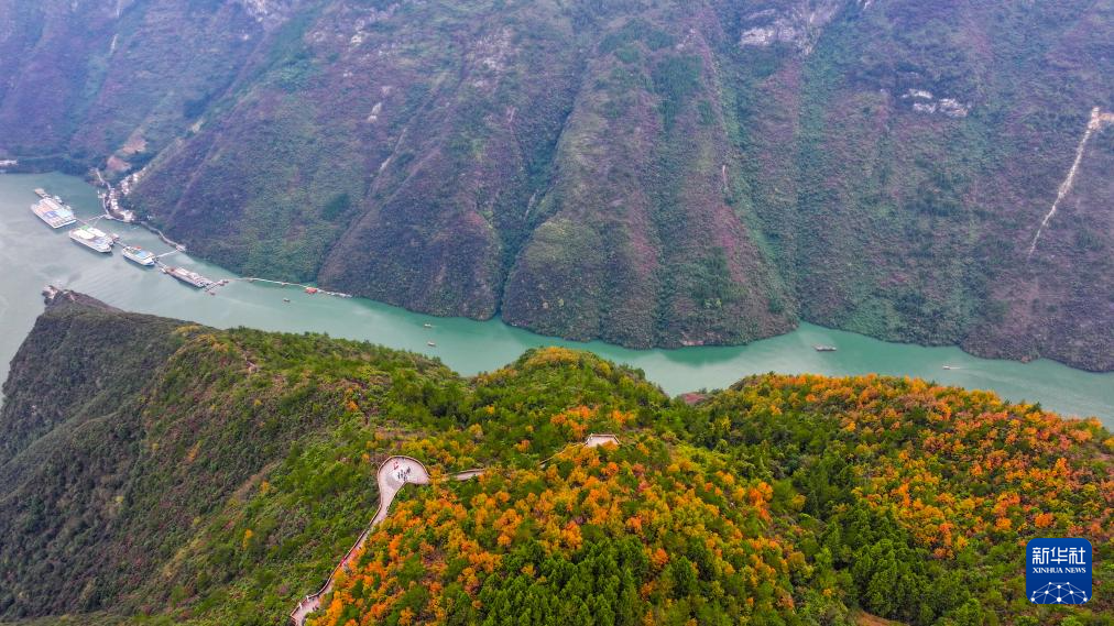 11月23日,游客在巫峡·神女景区观赏、拍摄红叶美景。