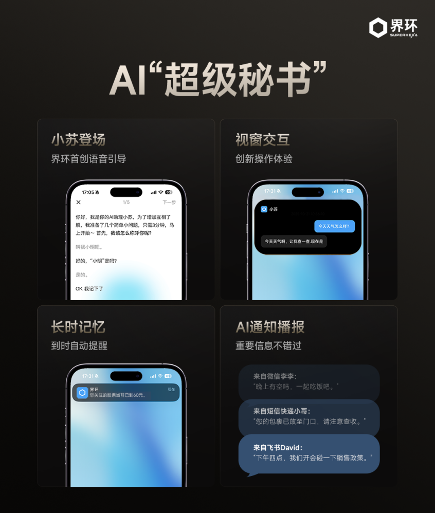 界环AI音频眼镜特别版的核心亮点在于AI交互能力的优化。全新Superhexa VUI 2.0语音交互系统,通过“小苏登场”语音引导与手机界面联动,降低操作门槛。系统支持连续对话,无需反复唤醒,可通过Android悬浮窗与iOS灵动岛实现可视化反馈,搭配长时记忆与语音提醒功能,帮助用户管理工作生活信息。